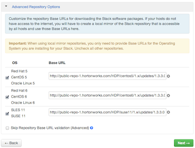 Under Advanced Repository Options, you can specify the Base URLs of your local repositories for each Operating System you plan to use in your cluster. You should have configured the Base URLs for your local repositories in Optional: Configure Ambari for Local Repositories.