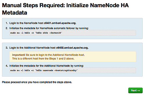 Initialize Metadata : Follow the instructions in the step. For this step you must log in to both the current NameNode and the additional NameNode. Make sure you are logged in to the correct host for each command. Click