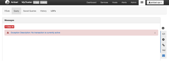 When a query fails, the Status field displays FAILED and there is a link to Failed Tasks and the error displays on the first page. Click Download data to get the data for the task. For further details on debugging, see the Tez View.