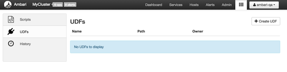UDFs can be added to Pig scripts by clicking Create UDF in the upper right corner of the UDFs window. In the Create UDF dialog box, point to a UDF in the system by specifying the name and path: