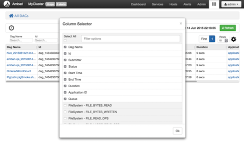 To select which columns are included in the Tez View search results, click the gear icon to the right of the search tool bar. A Column Selector dialog box appears where you can select which columns appear in the search results. Select the columns, and click Ok to return to the Tez View: