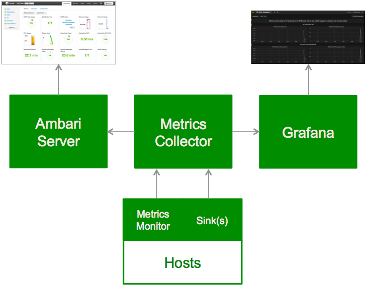 AMS has three primary components: Metrics Monitors, Hadoop Sinks, Metrics Collector, and Grafana.