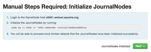 11. Initialize JournalNodes : Follow the instructions in the step. You need to login to your current NameNode host to run the command to initialize the JournalNodes. When Ambari detects success, the message on the bottom of the window changes. Click Next.