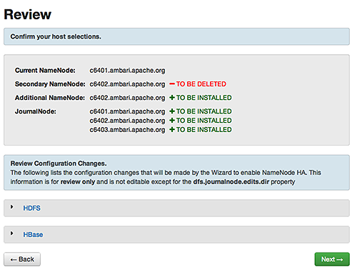 7. Select Hosts : Select a host for the additional NameNode and the JournalNodes. The wizard suggest options that you can adjust using the drop-down lists. Click Next to proceed.
