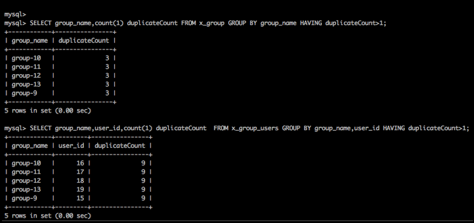 SELECT group_name,count(1) duplicateCount FROM x_group GROUP BY group_name HAVING duplicateCount>1;.If there are duplicate group-user mapping entries in the x_group_users table, this sql command will return the list of group-user mapping that are duplicates: