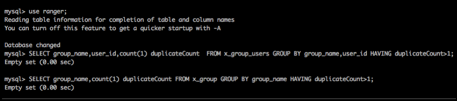 mysql> use ranger; Reading table information for completion of table and column names You can turn off this feature to get a quicker startup with -A Database changed mysql> SELECT group_name,user_id,count(1) duplicateCount FROM x_group_users GROUP BY group_name,user_id HAVING duplicateCount>1; Empty set (0.00 sec) mysql> SELECT group_name,count(1) duplicateCount FROM x_group GROUP BY group_name HAVING duplicateCount>1; Empty set (0.00 sec)