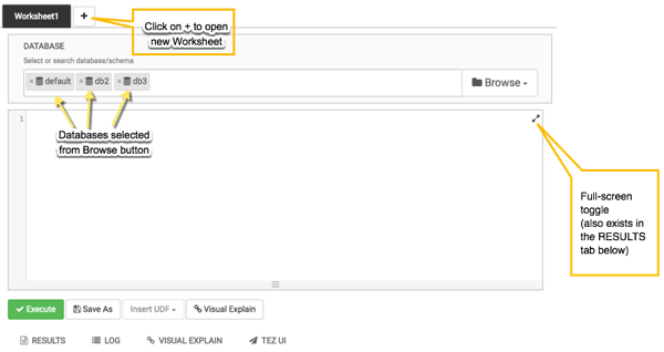 • Click on the + symbol to open a new worksheet tab. Queries executed from the new worksheet tab will execute in a different session. Queries from different worksheets can execute in parallel.