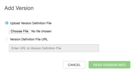 In Add Version, choose Upload Version Definition File and click Choose File. Browse to the directory on your local desktop where the VDF file has been stored, click Choose File, then click Read Version Info.