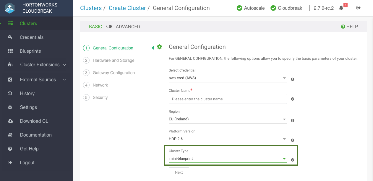 To use the uploaded blueprints, select it when creating a cluster. The option is available on the General Configuration page. First select the Platform Version and then select your chosen blueprint under Cluster Type.