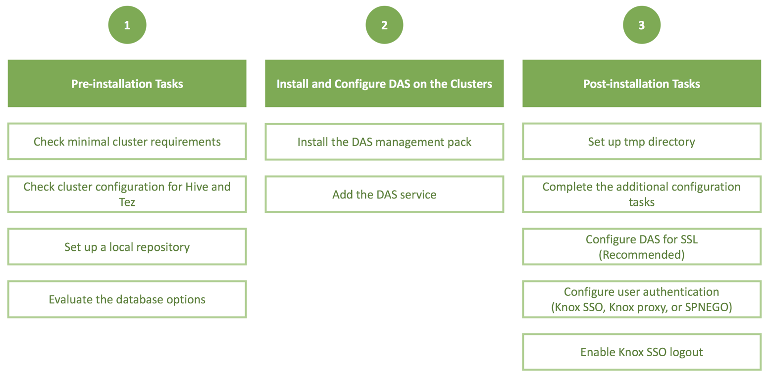 | 9 | Configure DAS for SSL. | It is recommended that you configure DAS for SSL. You can configure SSL if your HDP cluster is SSL-enabled. See (Recommended) Configuring DAS for SSL/TLS. |