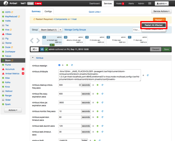 Select Storm in the navigation menu, then select Restart > Restart All Affected to restart the Storm service and load the new configuration.