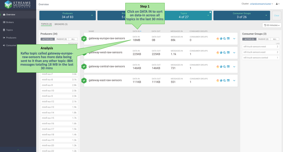 | Use Case 4 | For a given Kafka topic that is part of my application, which are all the connected producers sending data? In other words, which truck fleets are sending data to a gateway topic? |