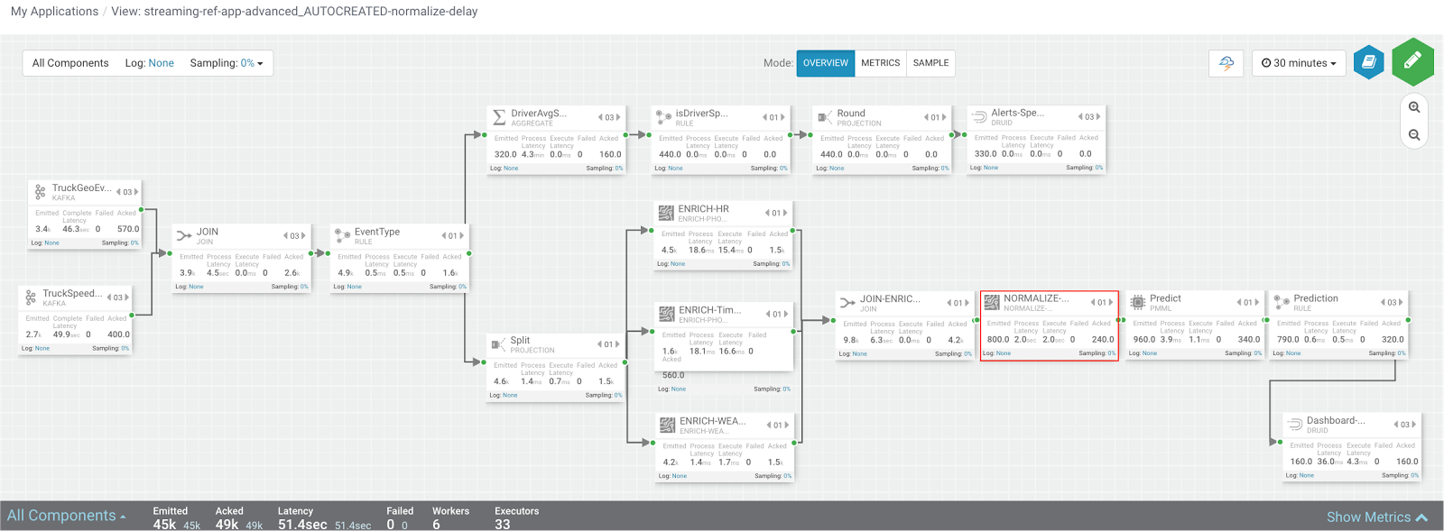 Scanning over the metrics, we see that the NORMALIZE-MODEL-FEATURES custom processor has high execute latency of 2 seconds. This means that over the last 30 minutes the average time an event spends in this component is 2 seconds.