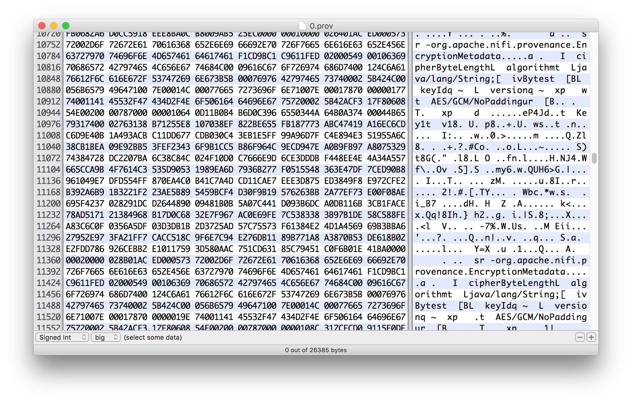 On record read, the process is reversed. The encryption metadata is parsed and used to decrypt the serialized bytes, which are then deserialized into a ProvenanceEventRecord object. The delegation to the normal schema record writer/reader allows for "random-access" (i.e. immediate seek without decryption of unnecessary records).