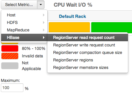 Each host in the cluster is represented by a block. To see more information on a specific host, hover your mouse over the block you are interested in, and a popup with key host data appears. The color of the blocks represents usage in an appropriate unit based on a selectable set of metrics. If the data necessary to determine state are not all available, the block is marked as having Invalid Data. Changing the default maximum values for the heatmap allows you to fine tune the representation. Use the Select Metric dropdown to select the metric type.