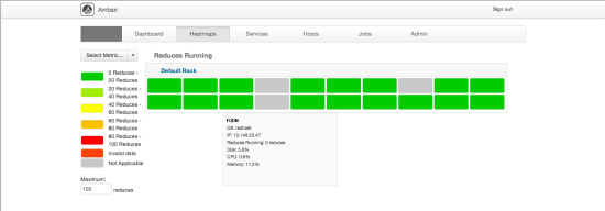 Each host in the cluster is represented by a block. To see more information on a specific host, hover your mouse over the block you are interested in, and a popup with key host data appears. The color of the blocks represents usage in an appropriate unit based on a selectable set of metrics. If the data necessary to determine state are not all available, the block is marked as having Invalid Data. Changing the default maximum values for the heatmap allows you to fine tune the representation. Use the Select Metric dropdown to select the metric type.