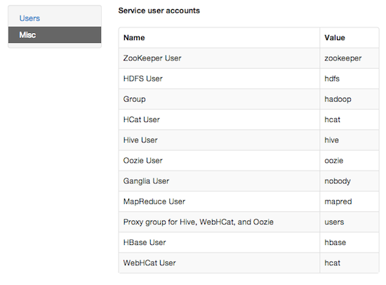 To check the service user accounts that have been assigned to various Hadoop services, click the Misc tab.