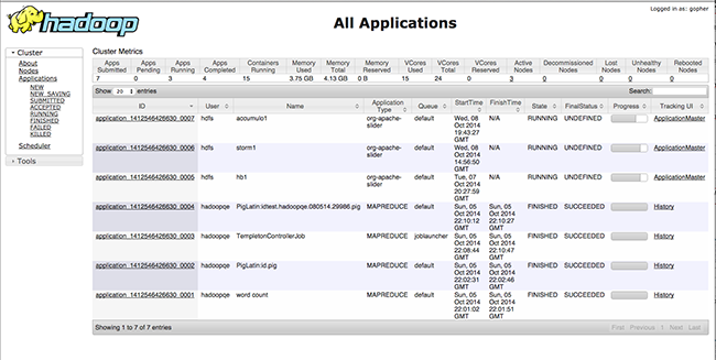 The successful launch of the Accumulo cluster can also be verified via the YARN Resource Manager Web UI. This UI is usually accessible via a Web browser at port 8088 of the Resource Manager Host:
