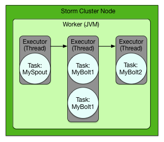 By default, Storm uses a parallelism factor of 1. Assuming a single-node Storm cluster, a parallelism factor of 1 means that one worker, or JVM, is assigned to execute the topology, and each component in the topology is assigned to a single executor. The following diagram illustrates this scenario. The topology defines a data flow with three tasks, a spout and two bolts.