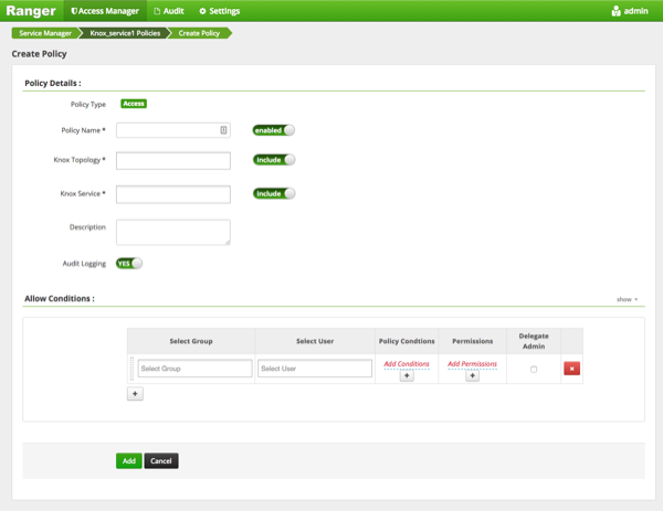 Field Description Policy Name Enter an appropriate policy name. This name cannot be duplicated across the system. This field is mandatory. Knox Topology Enter an appropriate Topology Name. Knox Service Enter an appropriate Service Name. Description (Optional) Describe the purpose of the policy. Audit Logging Specify whether this policy is audited. (De-select to disable auditing). Table 3.51. Allow Conditions