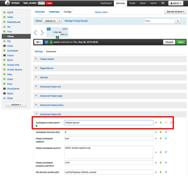 4. If HBase is running in secure mode, select HBase > Configs > Advanced on the Ambari dashboard, then select Advanced hbase-site. Set the value of the zookeeper.znode.parent property to /hbase-secure (if HBase is not running in secure mode, you can leave this property set to the default /hbase-unsecure value).