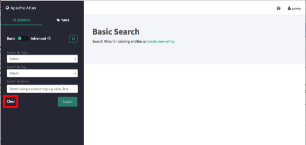 To search for entities, click SEARCH on the Atlas web UI. Select an entity type, an Atlas tag, or enter a text string, then click Search to display a list of the entities associated with the specified search criteria.