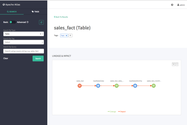 Table, and then selected the "sales_fact" entity. Data lineage and impact is displayed graphically, with each icon representing an action. You can use the + and - buttons to zoom in and out, and you can also click and drag to move the image.