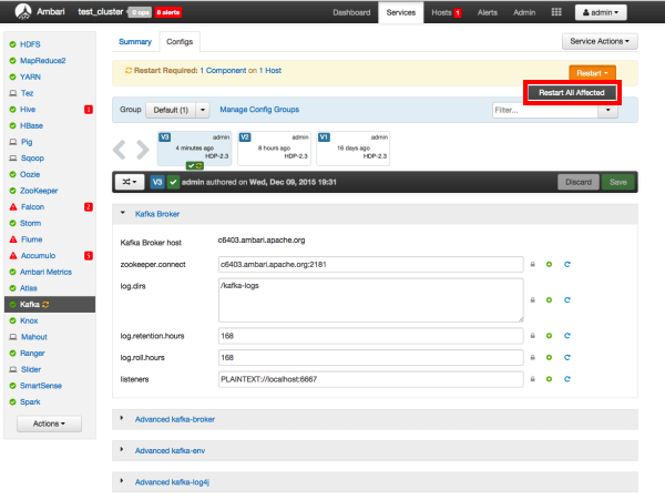Select Kafka in the navigation menu, then select Restart > Restart All Affected to restart the Kafka service and load the new configuration.