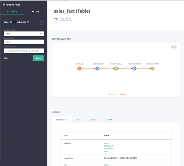 Table, and then selected the "sales_fact" entity. Data lineage and impact is displayed graphically, with each icon representing an action. You can use the + and - buttons to zoom in and out, and you can also click and drag to move the image.