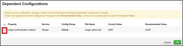 5. When you save the authentication method as Active Directory, a Dependent Configurations pop-up may appear recommending that you set the authentication method as LDAP. This recommended configuration should not be applied for AD, so you should clear (un-check) the ranger.authentication.method check box, then click OK.