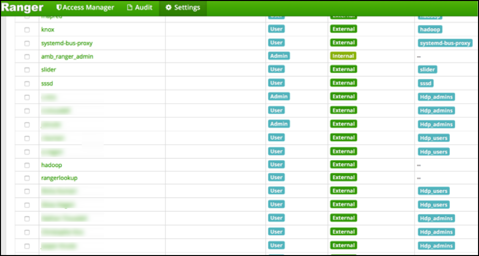 On the first page of Rangers user list there are lots of HDP system users. Most of them were put there by the Ranger installer and during the plugins installs: