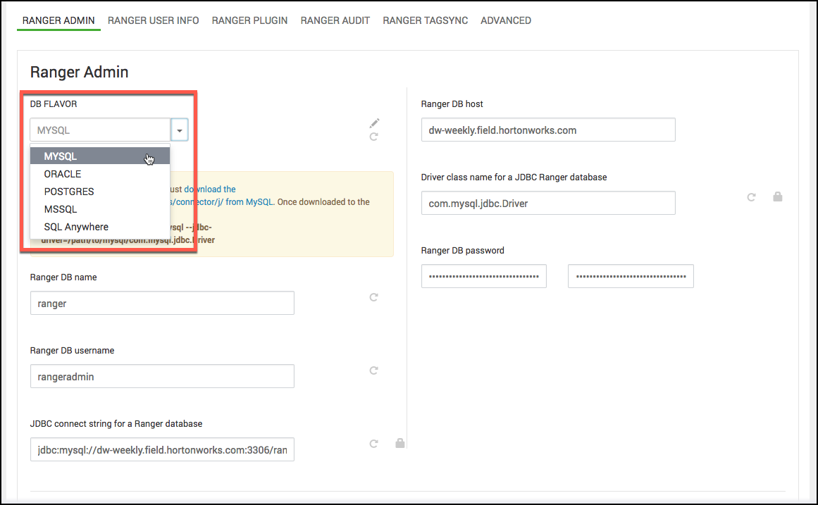 NoteRanger does not store the DBA user name and password after setup. Therefore, you can clear these values in the Ambari UI after the Ranger setup is complete.
